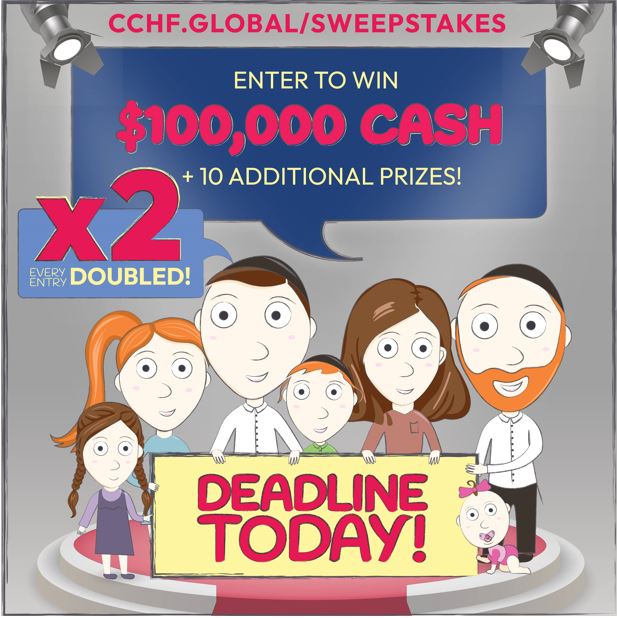 Make Pesach this year with an extra $100,000 from the Chofetz Chaim Heritage Foundation annual sweepstakes! Thursday, March 31, 2022 at 8:00 pm is the final deadline to enter and