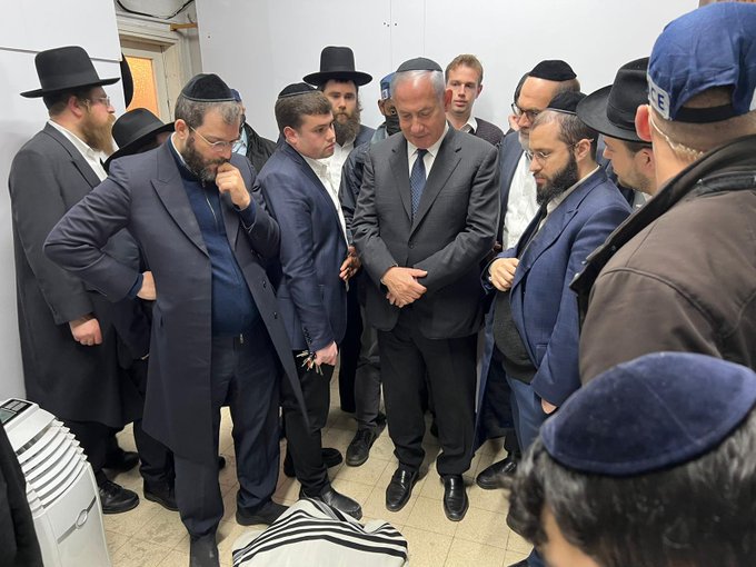 Former prime minister Binyamin Netanyahu traveled to Bnei Brak after midnight on Motzei Shabbos to pay his respects to HaGaon HaRav Chaim Kanievsky, zt’l. Netanyahu came accompanied by heavy security