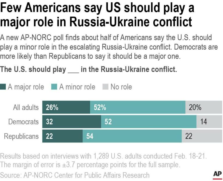 There’s little support among Americans for a major U.S. role in the Russia-Ukraine conflict, according to a new poll, even as President Joe Biden imposes new sanctions and threatens a