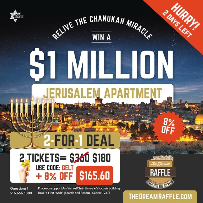 TODAY ONLY!!! USE CODE: GELT Get 8% OFF Win a $1,000,000 Jerusalem Apartment CLICK HERE FOR A CHANCE TO WIN! CLICK HERE FOR A CHANCE TO WIN!