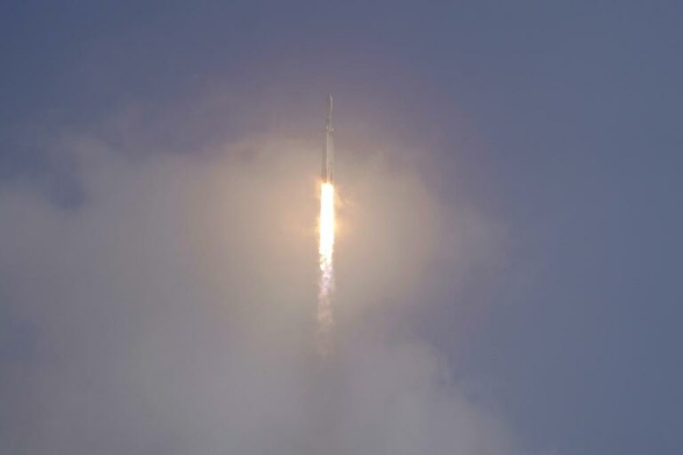 SpaceX launched its mega Falcon Heavy rocket for the first time in more than three years Tuesday, hoisting satellites for the military and then nailing side-by-side booster landings back near