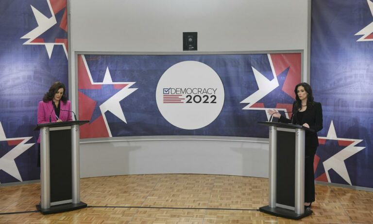 Michigan Gov. Gretchen Whitmer accused Republican challenger Tudor Dixon on Tuesday of “stoking violence” and pushing conspiracy theories meant to divide people, while Dixon said voters have felt the pain