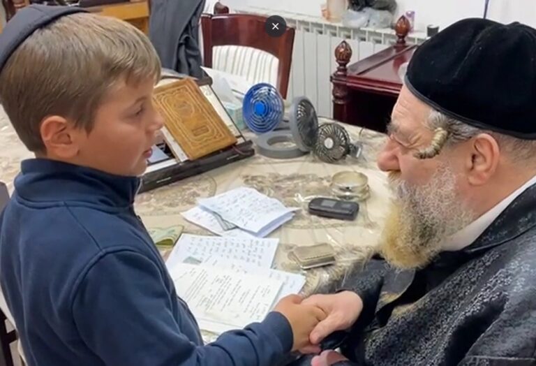 Shragi Orzel, a 4th grade talmid of Yeshivah of Spring Valley, repeating Mishnayos baal peh to the Rachmistrivka Rebbe in Eretz Yisroel. Shragi is the son of R’ Avrohom Orzel