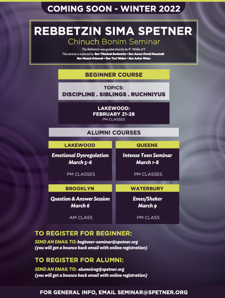 Alumni Classes in Brooklyn, Queens, Lakewood and Waterbury Join Rebitzen Spetner’s thousands of students from around the world who have transformed themselves, their homes, and their relationships with their children.