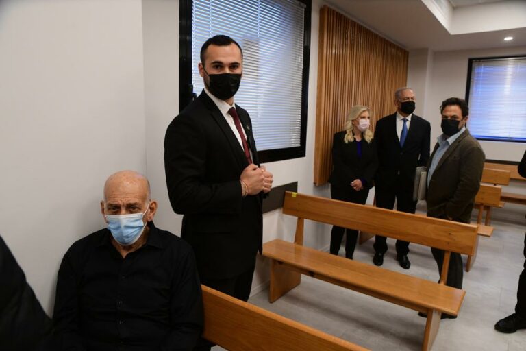 Two former Israeli prime ministers faced off in a Tel Aviv courtroom as Benjamin Netanyahu’s defamation suit against Ehud Olmert got underway on Monday. Netanyahu, his wife and son appeared