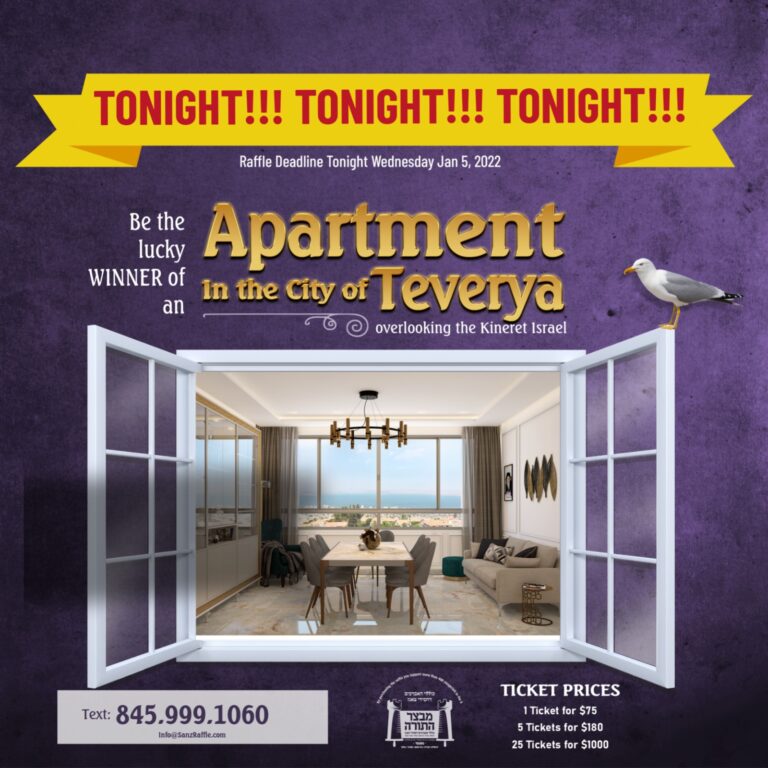 Raffle Deadline TONIGHT!!! Dream APARTMENT in ISRAEL Yossi Reichman from Flatbush won last years raffle for a beautiful APARTMENT in ISRAEL The deadline to enter is Tonight. CLICK HERE TO
