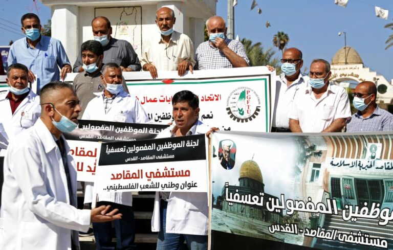 A group of nurses from the Gaza Strip staged a protest in a public square on Wednesday, saying an Israeli travel ban has led the Jerusalem hospital where they worked