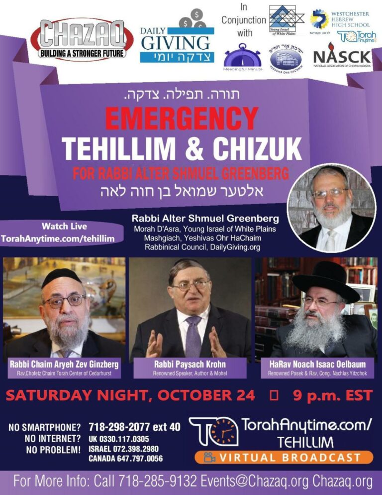 EMERGENCY TEHILLIM AND CHIZUK EVENT FOR RABBI ALTER SHMUEL GREENBERG THIS MOTZAI SHABBOS- OCTOBER 24th AT 9PM DailyGiving.org, Chazaq, and TorahAnytime.com will be sponsoring an emergency Tehillim and Chizuk program