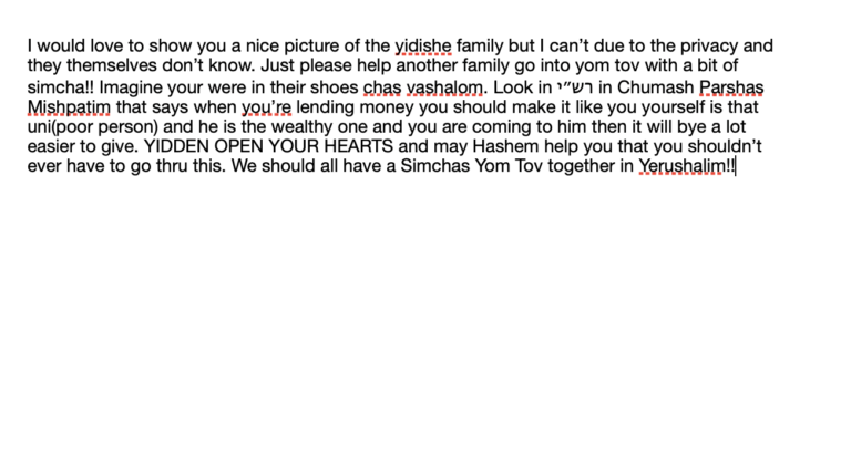 I’m collecting for a family for Yom Tov. Their daughter is also in cemenary in Eretz Yisroel which put them in debt… its really hard for them and they don’t
