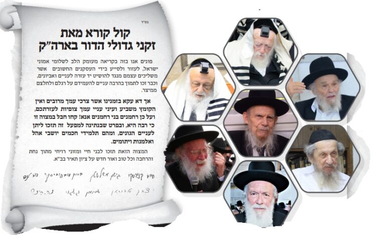 In a special letter published on Wednesday evening, Hagaon HaRav Chaim Kanievsky and Rosh Yeshivah HaRav Gershon Edelstein called for tefillos to take place outdoors and to refrain from hosting