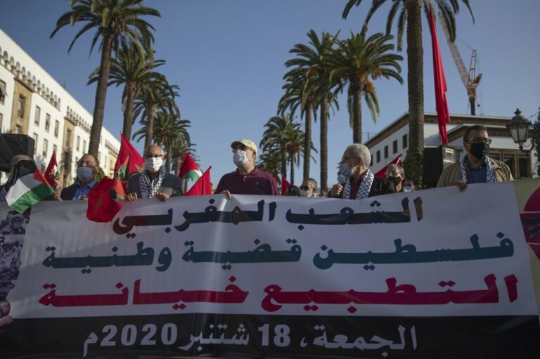 Despite a government ban on large gatherings to prevent the spread of the coronavirus, scores of demonstrators protested outside the Moroccan Parliament to denounce Arab countries agreeing o normalize ties