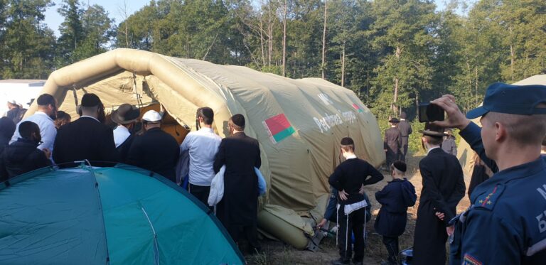 In a humanitarian gesture, the Belarusian government set up huge tents and chemical toilets for the Breslover chassidim still waiting by the Ukrainian border in hopes of entering the country