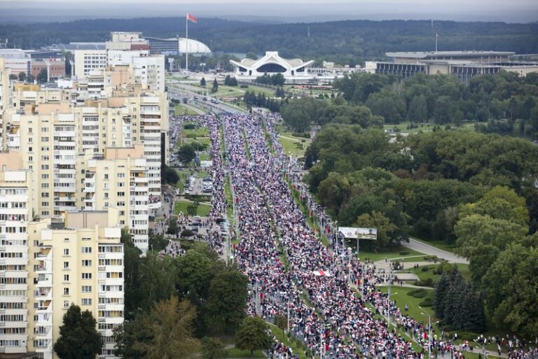 Tens of thousands of demonstrators marched Sunday to the outskirts of the presidential residence in the capital of Belarus, calling for the country’s authoritarian leader to resign as protests against