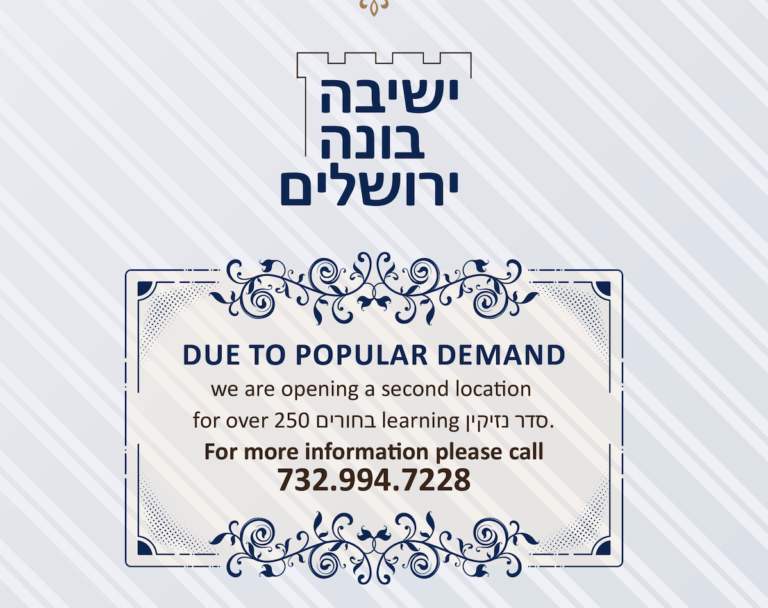 Yeshiva and Kollel Bonei Yerushalayim is opening for the coming Elul Zman for all bochurim and Yungleit who were planning on going to Eretz Yisroel. Call 732-901-5210 or email [email protected]