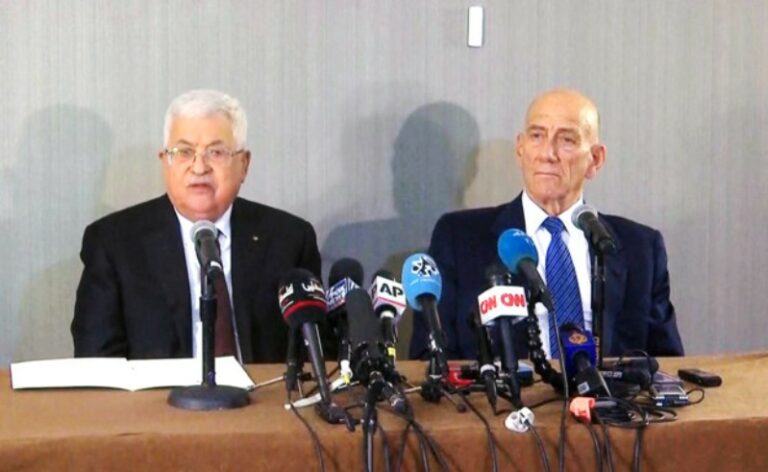 Palestinian President Mahmoud Abbas and former Prime Minister and convict Ehud Olmert held a joint press conference in New York on Tuesday where they denounced U.S. President Donald Trump’s Middle