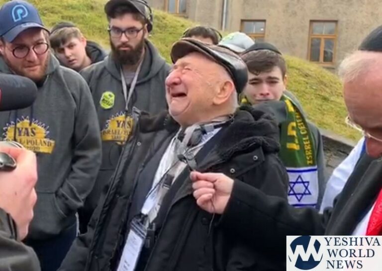 In a moving scene by Auschwitz, an English-speaking Holocaust survivor told his story, surrounded by a group of 25 boys from Ateres Shimon from Far Rockaway. Rabbi Shmuel Beller, 92,