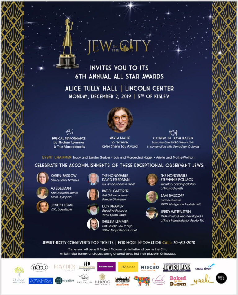 Jew in the City’s All Star Awards is: The Greatest Night in Orthodox Jewish Professional Success! Now in its 6th year, taking place at Lincoln Center’s Alice Tully Hall, the
