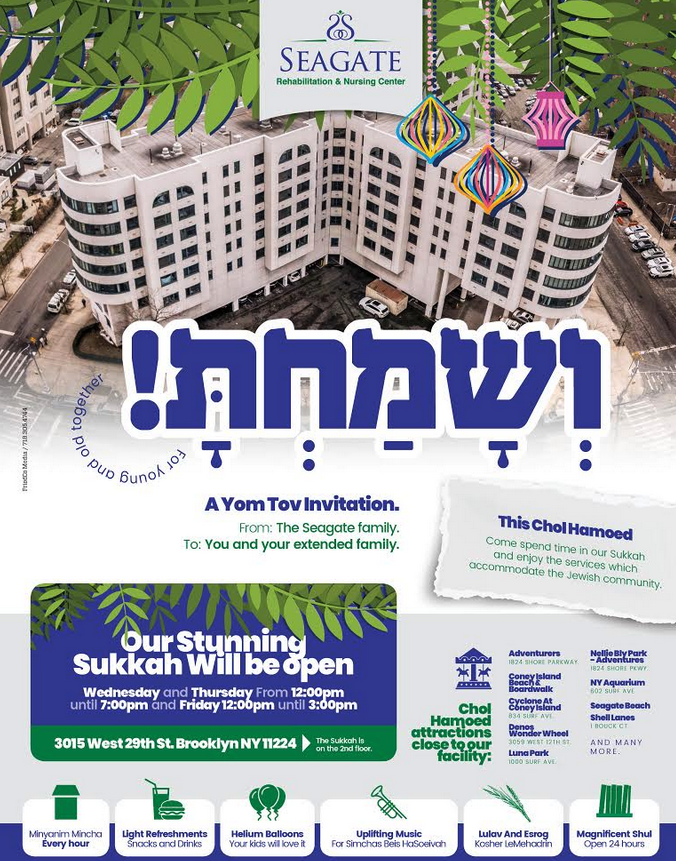 Seagate Nursing and Rehabilitation Center Invites Chol Hamoed Revelers to Enjoy Their Lavish Sukkah. This Sukkos, a new service is available to the public during Chol Hamoed. Seagate Nursing and