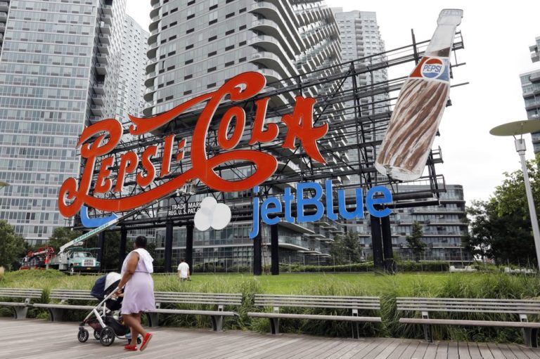 A landmark Pepsi sign along New York City’s East River will also promote JetBlue for the next six weeks, and critics are finding it hard to swallow. An illuminated blue