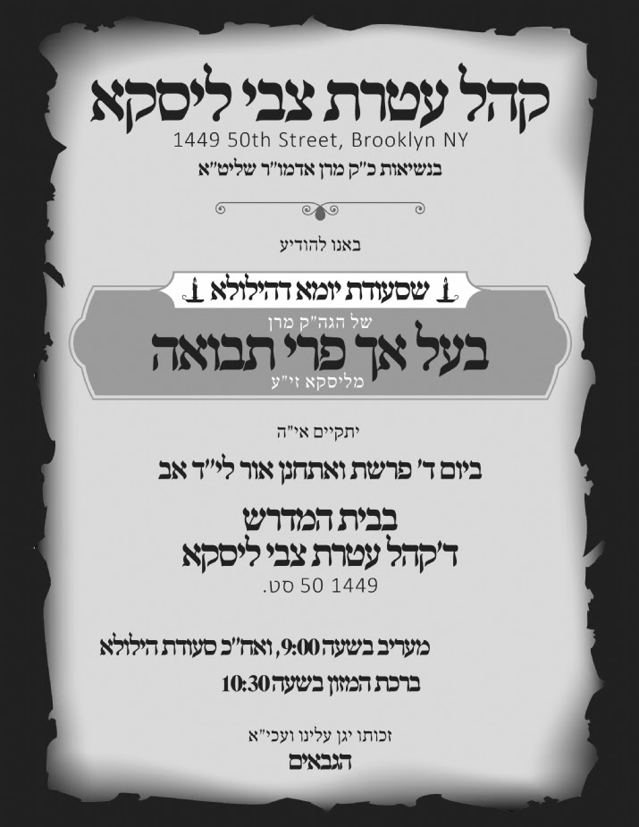 Yidden throughout the world are preparing to commemorate the 145 yahrtzeit of Rav Tzvi Hersh of Liska commonly referred to by the name of his sefer – Ach Pri Tevuah
