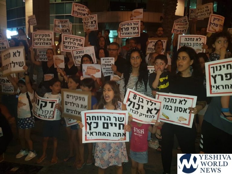 Some 200 parents of children with allergies took to the streets of Tel Aviv on Monday night as part of an ongoing protest, concerned over who will provide “life-saving treatment