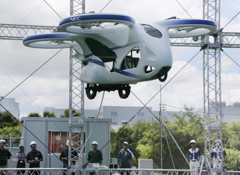 Japanese electronics maker NEC Corp. on Monday showed a “flying car,” a large drone-like machine with four propellers that hovered steadily for about a minute. The test flight reaching 3