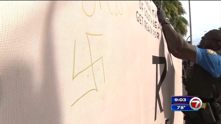 The following is via WSVN: Police are searching for the person or people responsible for scrawling swastikas on two signs in front of a hotel in the heart of South