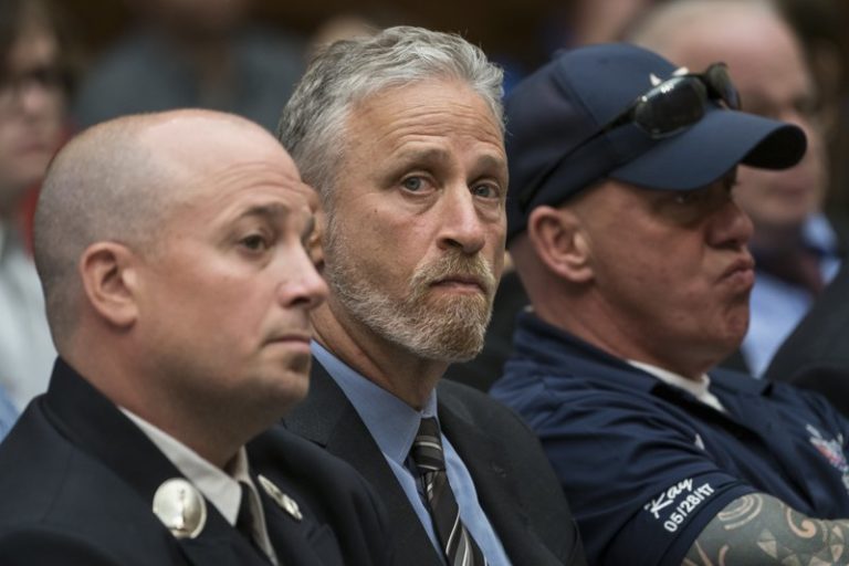 Comic Jon Stewart used his buddy Stephen Colbert’s late-night show to keep the heat on Senate Majority Leader Mitch McConnell for passage of legislation to replenish a victims’ fund for