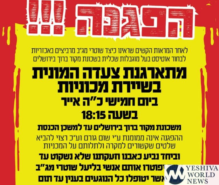A protest vehicular convoy is planned for Thursday, May 30, 2019 at 6:15PM beginning in Jerusalem’s Makor Baruch neighborhood and traveling to the Knesset. The protest is a response to