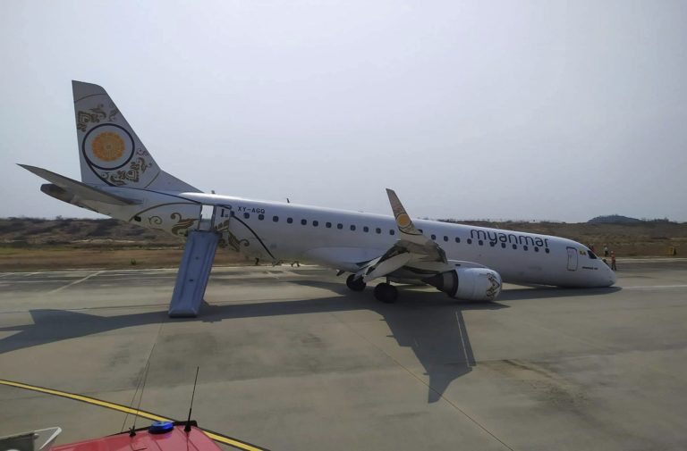 A Myanmar National Airlines plane made an emergency landing at Mandalay International Airport on Sunday, using only its rear wheels after the front landing gear failed to deploy. All 82