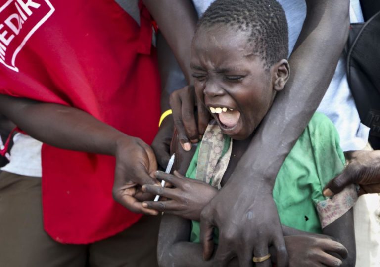 Despondent, Akon Mathiong points to two small mounds of dirt where she buried her grandsons, 4 and 5 years old, last month. They died after contracting measles in one of