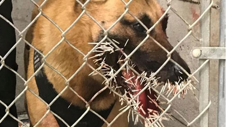 A police dog that stumbled on a porcupine and got more than 200 quills stuck on his face while pursuing a suspect is resting comfortably Tuesday and will not lose