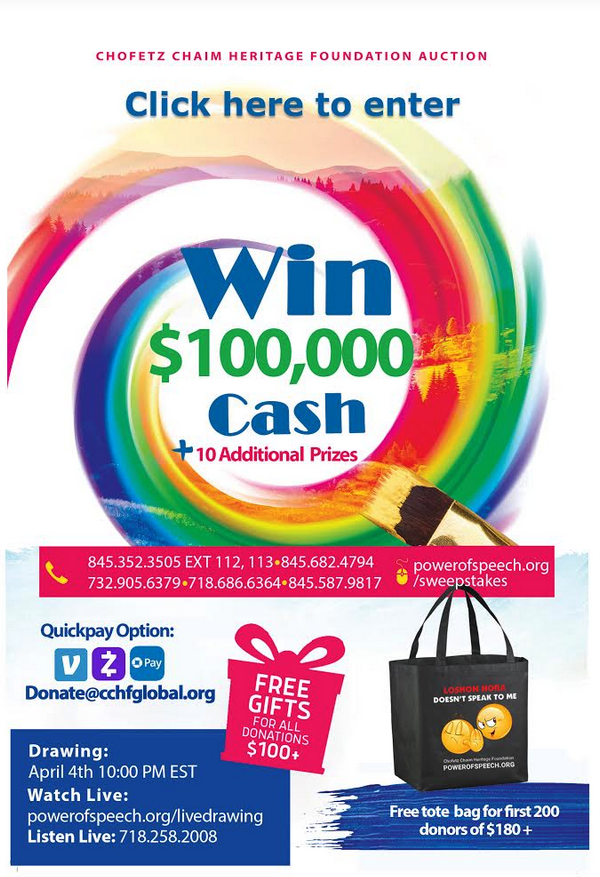 You can win $100,000 Cash in the Chofetz Chaim Heritage Foundation Annual Sweepstakes. Today all entries are doubled! This Thursday, April 4, 2019 at 8PM is the final deadline. For over 10