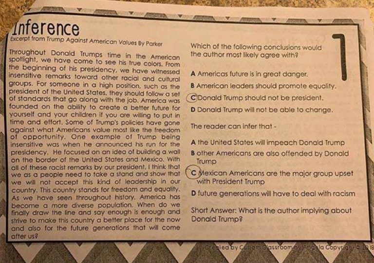 A Houston-area school district says one of its teachers used poor judgment when she had her students read an essay critical of President Donald Trump. The teacher had her 7th
