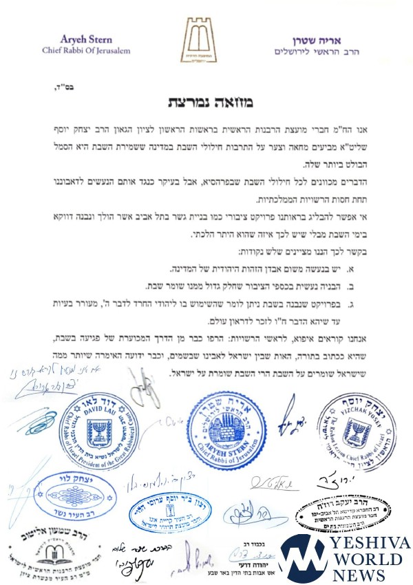 The Chief Rabbis of Israel and Jerusalem Chief Rabbi Aryeh Stern, have joined the battle against continued chilul Shabbos in the construction of the Yehudit Bridge in Tel Aviv. The