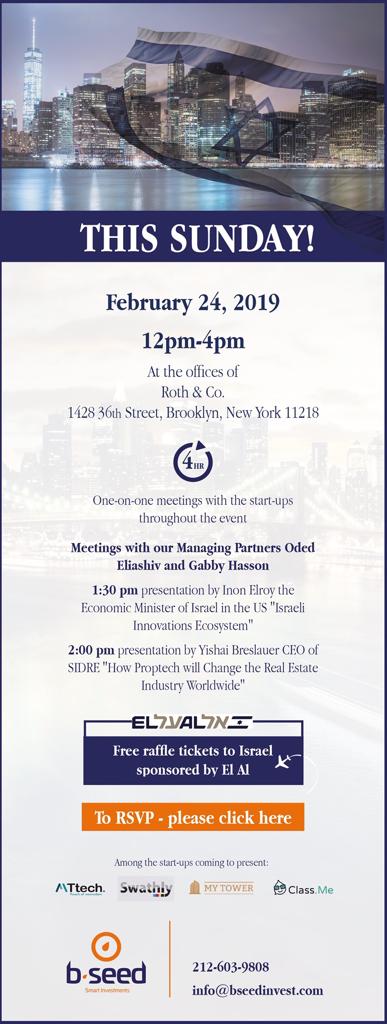 This Sunday: The Start-up Nation Visits NYC Don’t Miss Out on This Opportunity to Meet Israel’s Top Start-ups New York, February 21, 2019 Bseed, an investment company based in Israel,