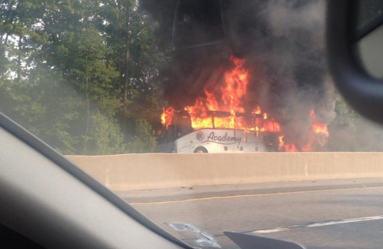 State police say a chartered bus caught fire while traveling on the New Jersey Turnpike, but no injuries were reported. There were 23 passengers aboard the New York City-bound bus