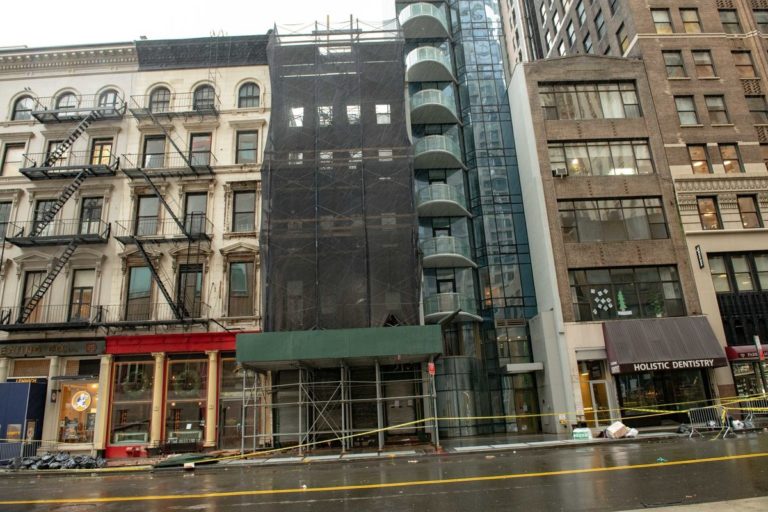 Half of the roof of a vacant five-story building in lower Manhattan caved in Friday, causing the floors beneath it to collapse and sending debris tumbling, officials said. No one