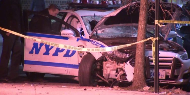 Authorities say a police cruiser jumped a curb, hit a pedestrian and struck a building while responding to a call in New York City. The New York Police Department says