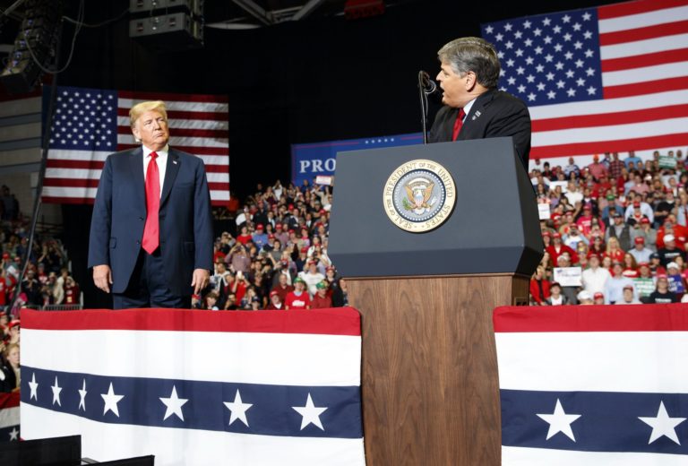 Sean Hannity spoke from the stage of President Donald Trump’s last midterm election rally, after Fox News Channel and its most popular personality had insisted all day that he wouldn’t.