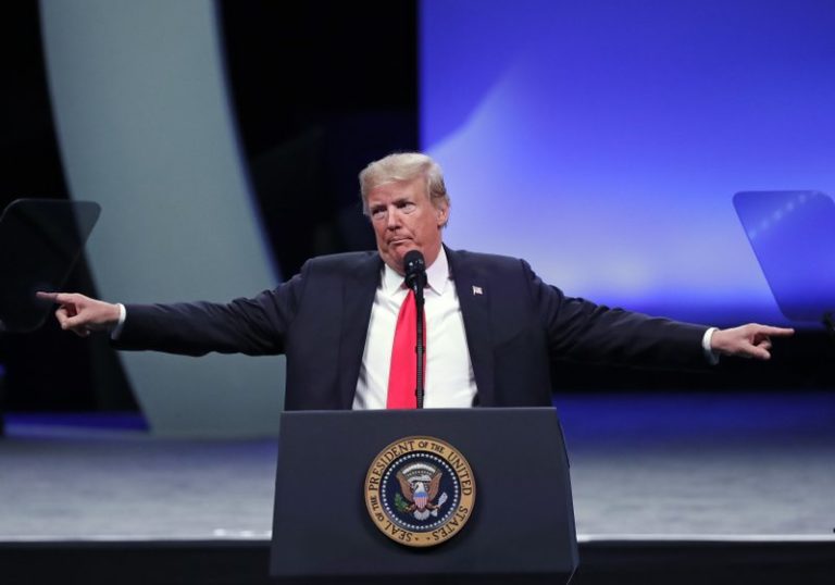 President Donald Trump drew an enthusiastic response from a law-and-order crowd Monday, advocating the use of “stop and frisk” policing and saying he has directed the Justice Department to work