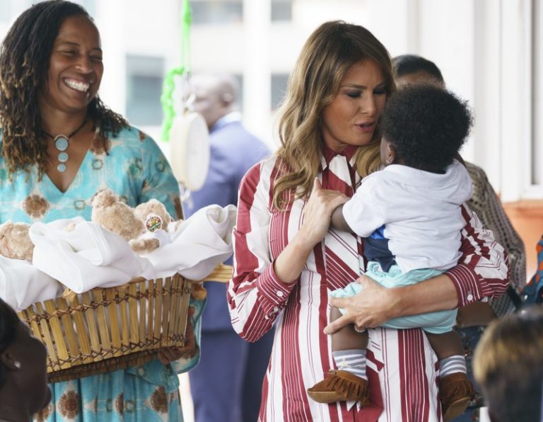 Melania Trump opened her first big solo international trip as U.S. first lady on Tuesday with a wave, a smile and a baby in her arms, aiming to promote child