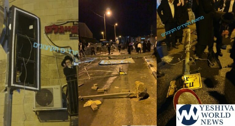 The attached photos and videos speak for themselves. Following the Monday night Hafganos on Bar Ilan Street, the area was littered with broken glass, smoldering dumpsters and widespread destruction of