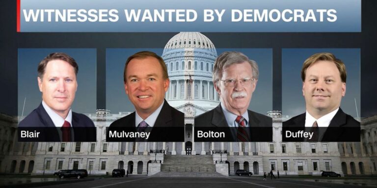 Senate Democrats are proposing a weekslong Senate impeachment trial seeking testimony from four new witnesses including John Bolton and Mick Mulvaney over President Donald Trump’s actions toward Ukraine, according to