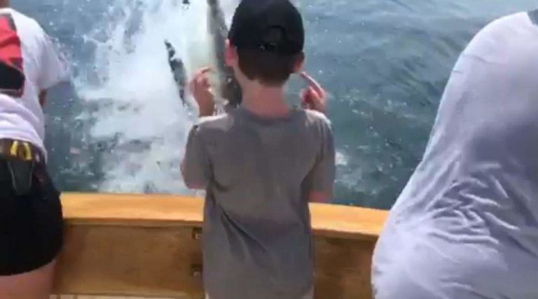 ORLEANS, Mass. – A family fishing in Cape Cod Bay had an up close and personal encounter with a great white shark that leaped out of the water to snatch