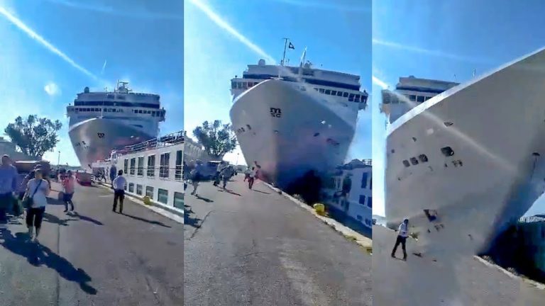 A towering, out-of-control cruise ship rammed into a dock and a tourist riverboat on a busy Venice canal on Sunday morning, injuring five people, officials said. The collision sparked new