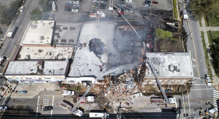 A gas explosion that partially collapsed a North Carolina building and set it ablaze Wednesday morning killed one person and injured more than a dozen others, police said. Police cars