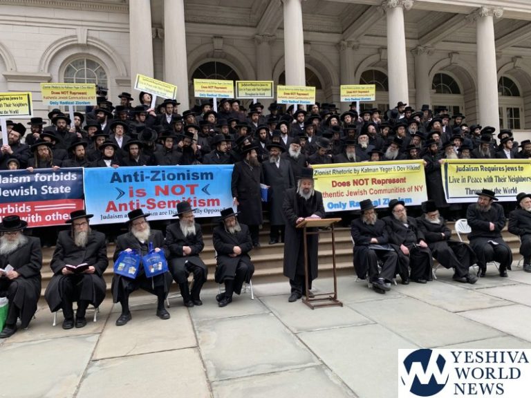 A few dozens terrorist-loving Neturei Karta cult members protested outside New York City Hall on Tuesday afternoon, regarding recent factual statements made by Councilman Kalman Yeger that “Palestine does not