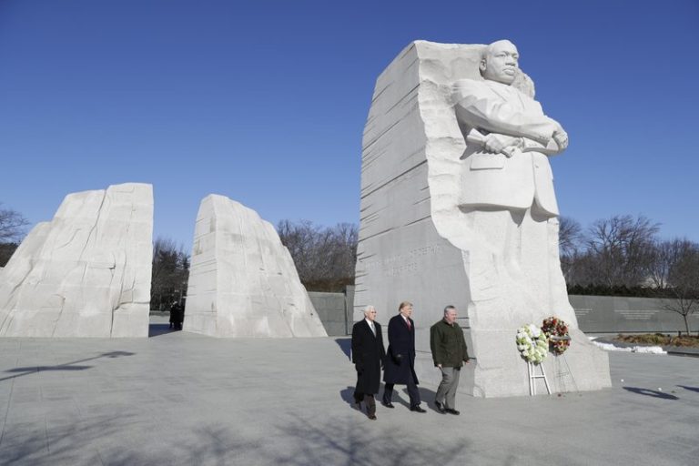 President Donald Trump paid a brief visit to the Martin Luther King Jr. memorial in Washington on the holiday honoring the civil rights leader. Trump was joined by Vice President