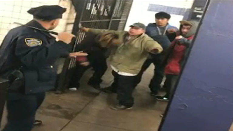 Shocking video shows a lone New York City police officer fending off several men who appear to be ganging up on him inside a Lower East Side subway station. One